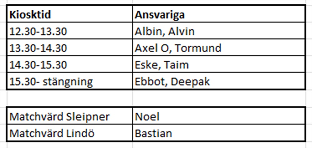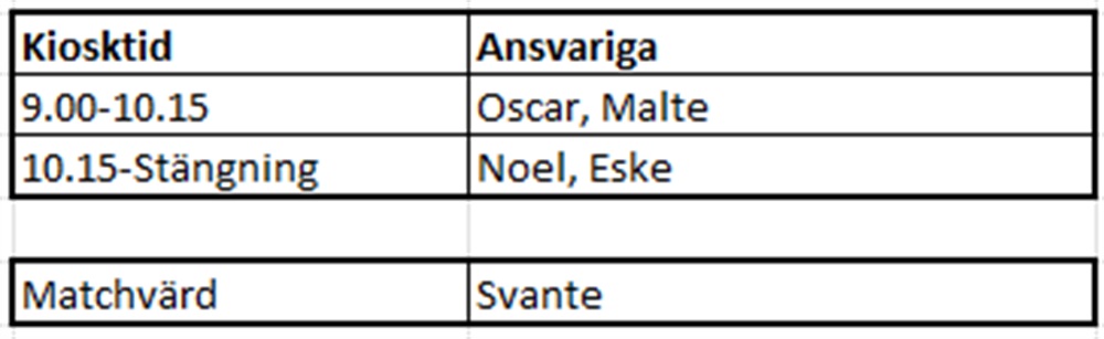 Spelarna kommer ha 5 matcher under helgen, fre-sön. Spelarna får lunch fredag – söndag och även middag fredag och lördag. I vårt tält kommer vi har samma upplägg som i år med frukt, kex osv.