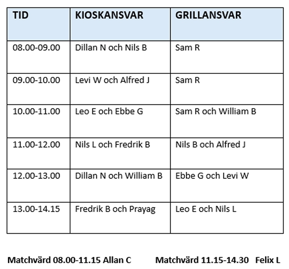 Tydliga instruktioner avseende kiosk, grill och funktionen som matchvärd kommer att finnas på plats på lördag.