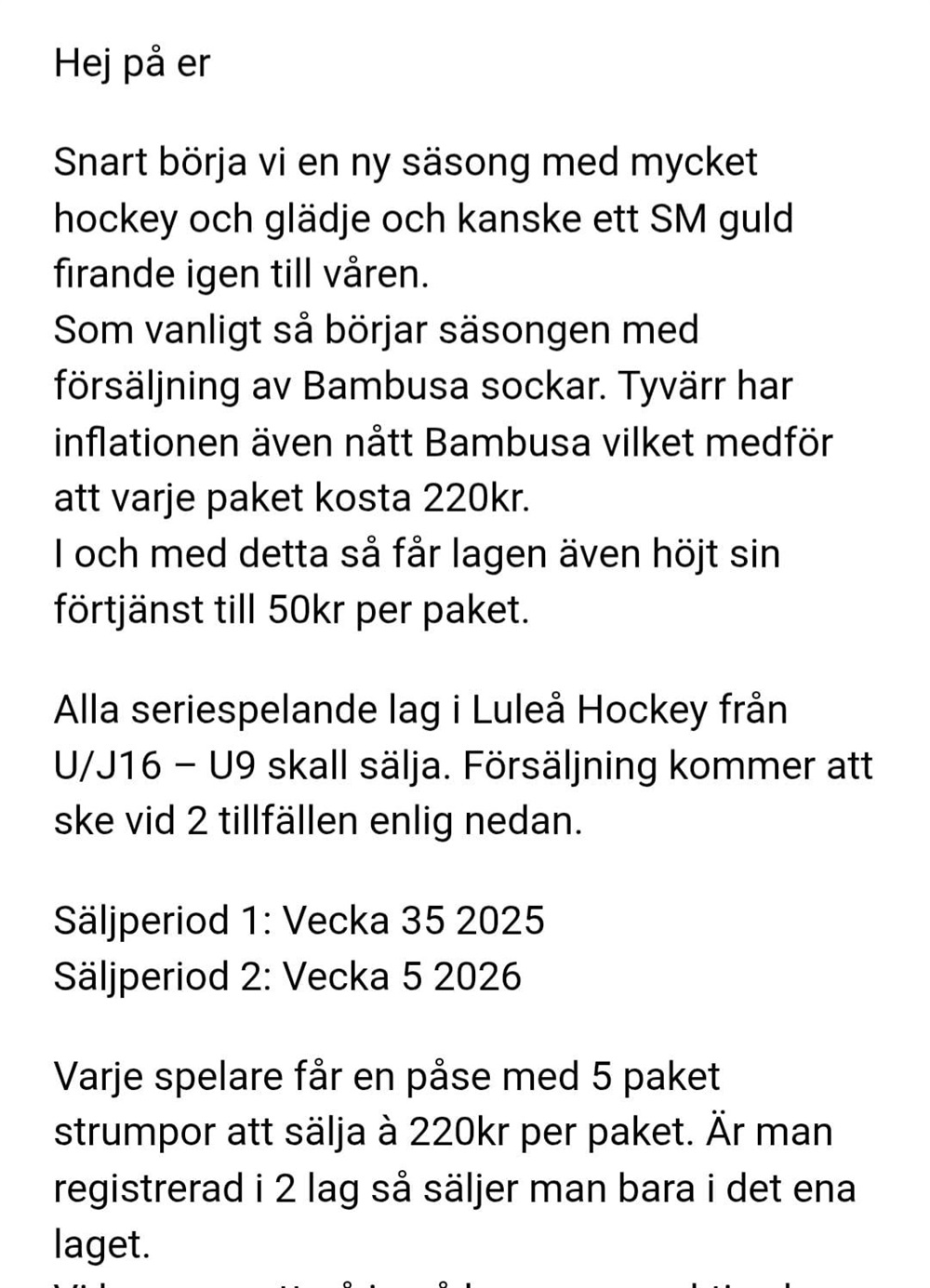 Nu har sockarna kommit, dom ska vara betalda senast 7/9 till Andreas 0702998250. Dom kostar 1100 kr/påse, alla spelare ska sälja 1 påse var, kom ihåg att hämta dom av någon av våra ledare. Vi ledare kommer lägga ut tider i Whatsapgruppen när vi har möjlighet att lämna ut påsarna. Kommer finnas att hämtas ut i B-hallen.