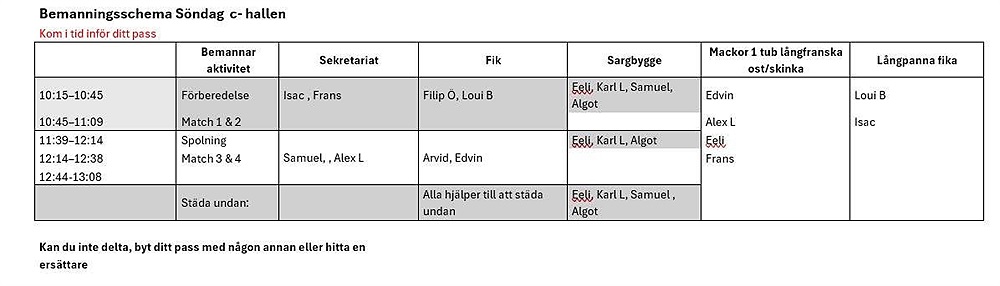 Här kommer söndagens arbetsschema. Som vanligt förväntans ni närvara om ni har ett arbetspass på ert barn under angiven tid, kan ni inte delta just då så ansvarar ni själva för att byta med någon. Lagledningen ansvarar inte för några byten.