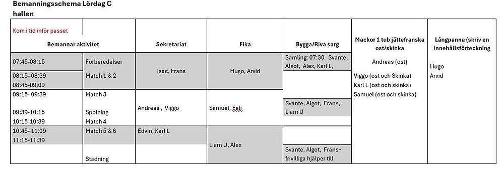 Här kommer lördagens arbetsschema. Som vanligt förväntans ni närvara om ni har ett arbetspass på ert barn under angiven tid, kan ni inte delta just då så ansvarar ni själva för att byta med någon. Lagledningen ansvarar inte för några byten.