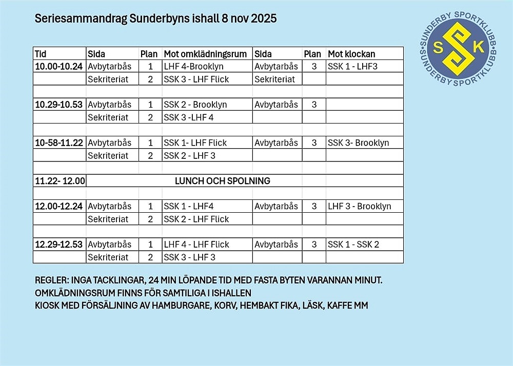 Matcher (tid och motståndare) och lagindelning för de som ska till Sunderbyn