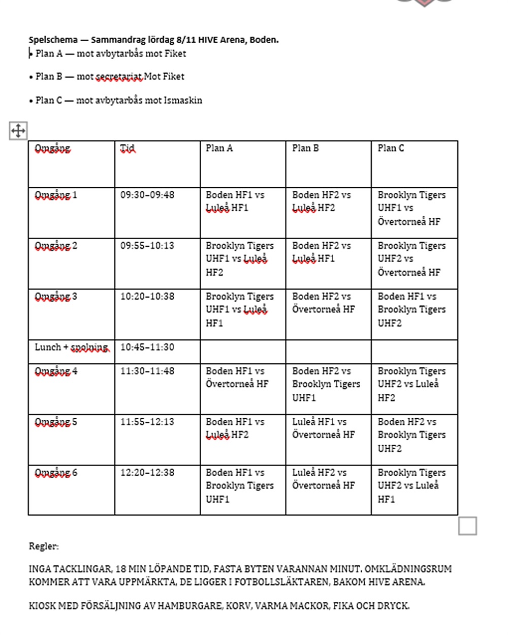 Matcher (tid och motståndare) och lagindelning för de som ska till Boden