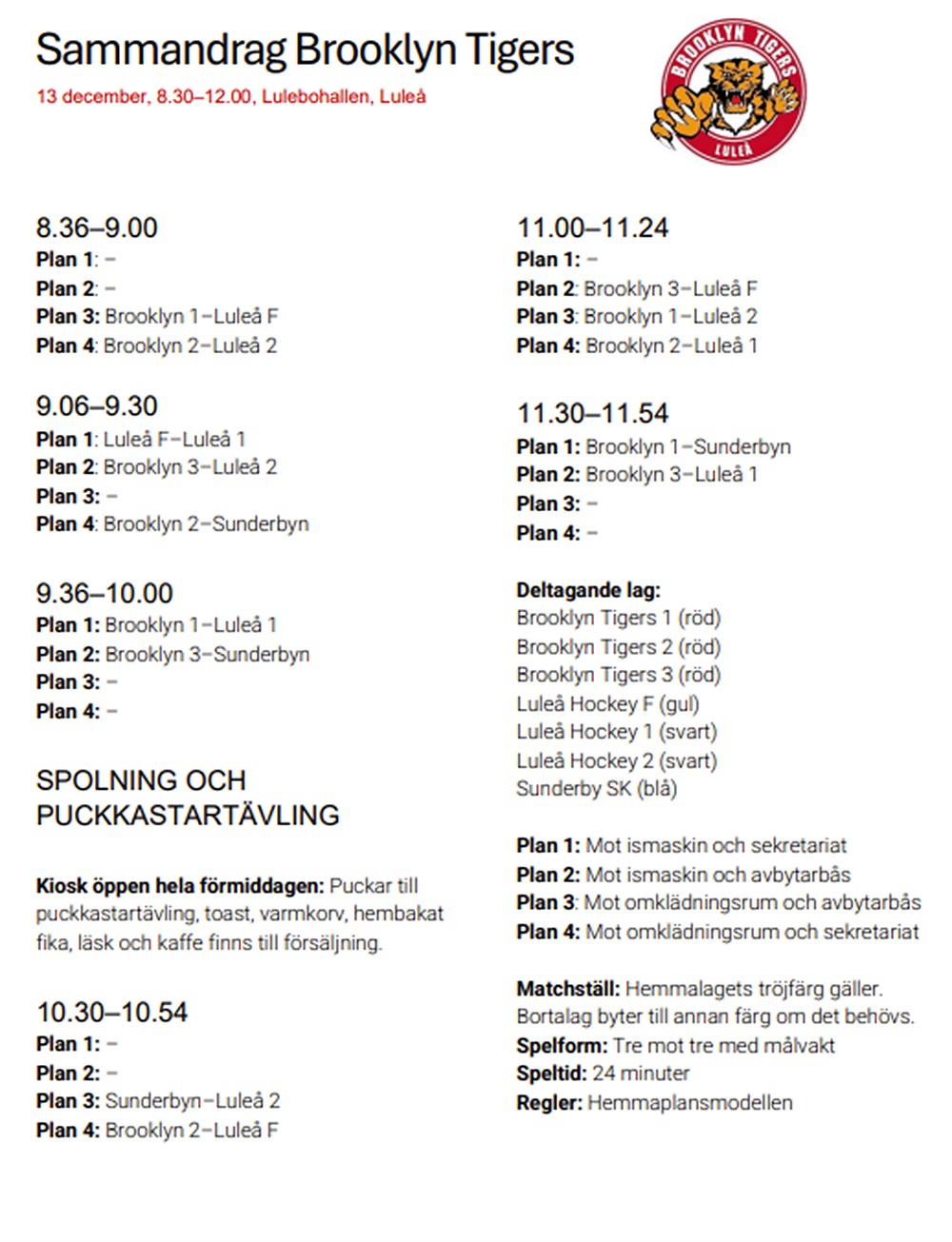 Det är 4 matcher för varje lag och totalt 10 spelare per lag som är uttagna. Det innebär att alla utespelare kommer spela 3 matcher var (alla utespelare står över en match) förutom målvakten som står alla 4 matcher. Är det någon som vill stå så hör av er till Timmy. Närmare lagindelning per match kommer under veckan.