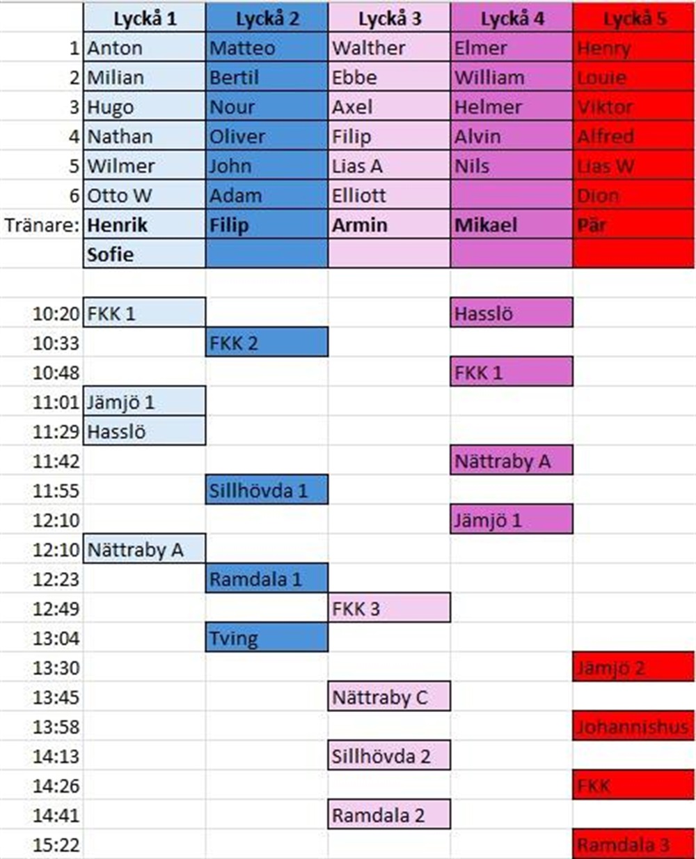Notera att samlingen sker 20 minuter innan första matchen för varje lag. Alltså är samlingen olika.