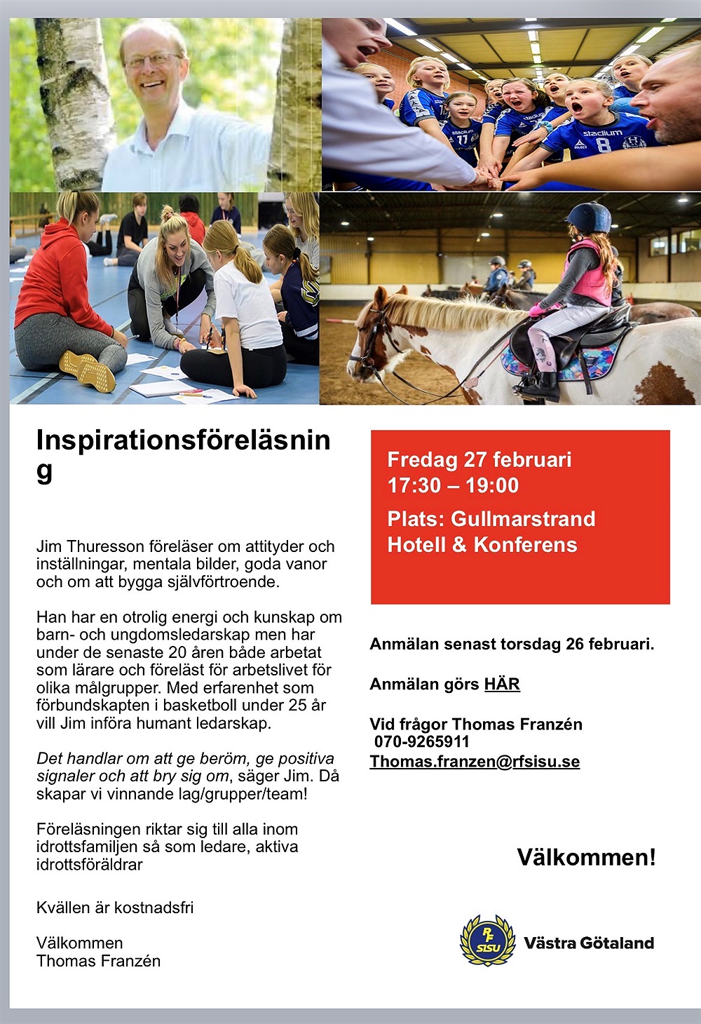 Den 27 februari klockan 17.30-19.00 är man välkommen på föreläsning med Jan Thuresson som föreläser om attityder och inställningar, mentala bilder, goda vanor och om att bygga självförtroende.