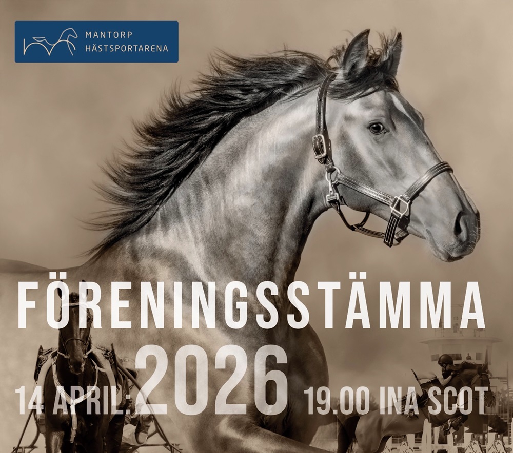 Tisdag 14 april kl 19.00. Plats: Mantorp Hästsportarena – Ina Scot logen.
