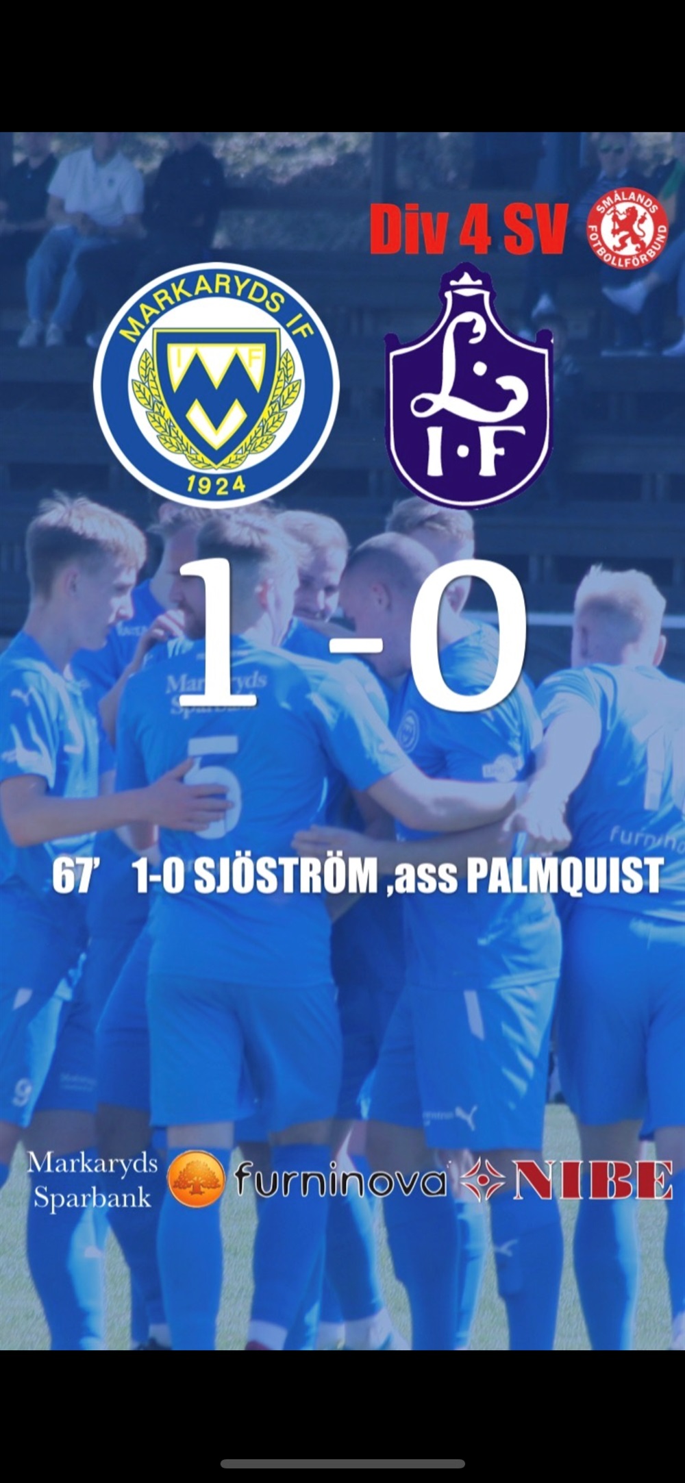 En underbar och viktig seger. Precis som väntat är det två bra lag som möts och precis som i ett derby är det tillknäppt och tufft spel. Ljungby får en straff i första halvlek som dem missar. Innan dess är det bra spel från vår sida där vi kontrollerar och styr spelet. Även andra halvlek är det vi som styr spelet och försöker hitta igenom ett kompakt Ljungby. På en halvdålig rensning så gör Liam en ”halvbycikleta” där sedan Palle NICKskarvar bollen vidare till Sjöström som sätter ditt avgörandet, hans 10 fullträff för säsongen. Nu laddar vi för en ny viktig hemmamatch mot Lagans AIK på måndag den 26/6 också den på underbara Skärsjövallen. Hoppas på lika fantastisk uppslutning då!