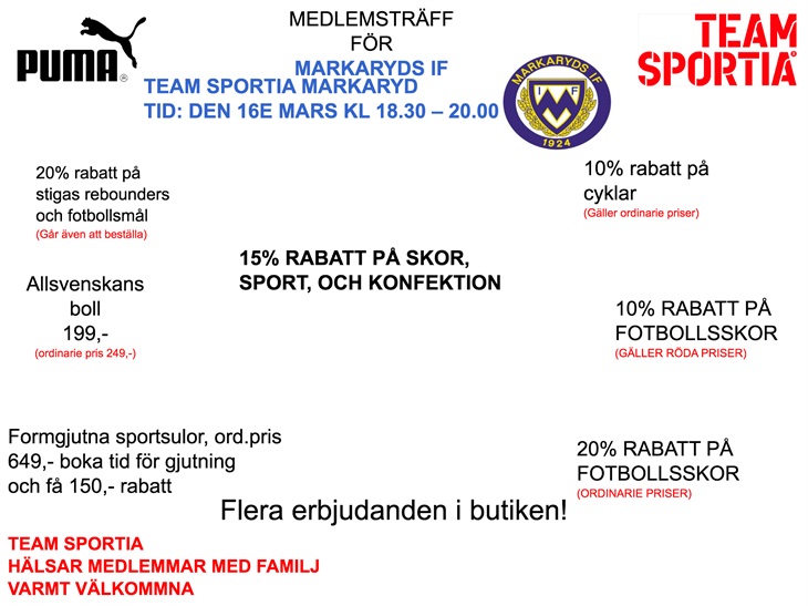 Den 16 mars kl 18:30 - 20:00 håller Team Sportia Markaryd med flera erbjudanden för medlemmar i Markaryds IF. Varmt välkomna.