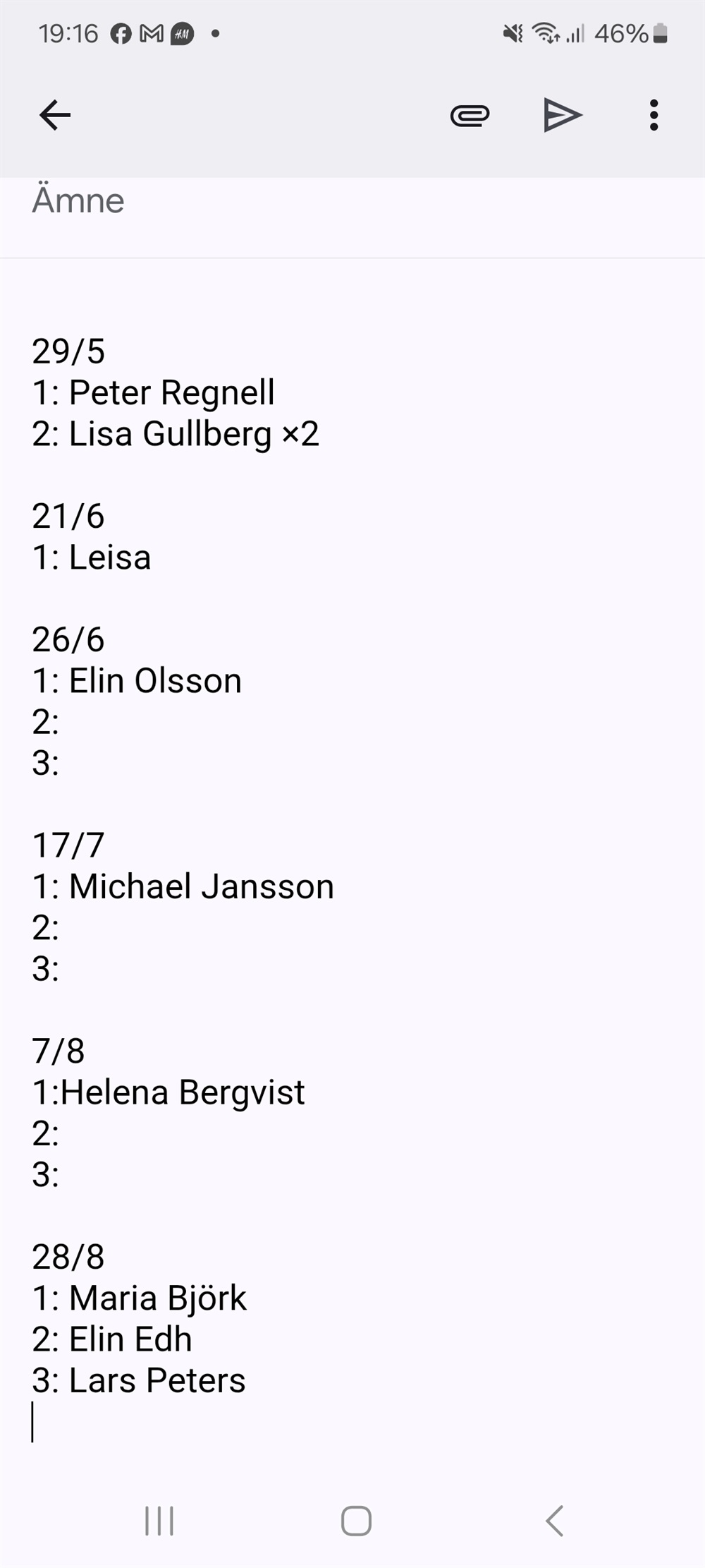 Här behöver vi hjälpas åt att bemanna alla tider. Skriv vilket pass ni kan hjälpa till med.