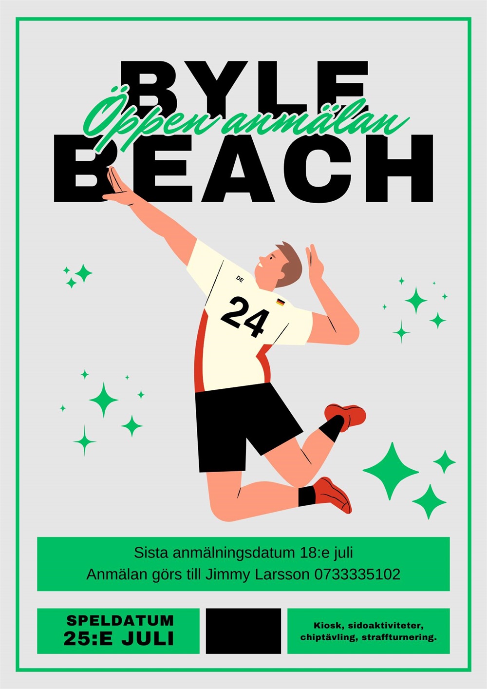 Anmälan till 2026 års upplaga av Byle beachen är nu officiellt öppen. Så börja spåna på lag till turneringen. Men främst boka in datumet! Vi går för nytt rekord igen som tidigare kostar det 100:-/spelare. Lite snabbt om turneringen! Underlaget är gräs, lagen består av minimum 4 spelare, det är en amatörturnering. Vi kommer ha 3 planer tillgängliga, möjligt med 4 beroende på anmälda lag! Turneringen bygger på laganda och att man ska ha förbannat kul tillsammans. Hoppas vi ses OCH DELA INLÄGGET! Anmälan till Jimmy Larsson 0733335102