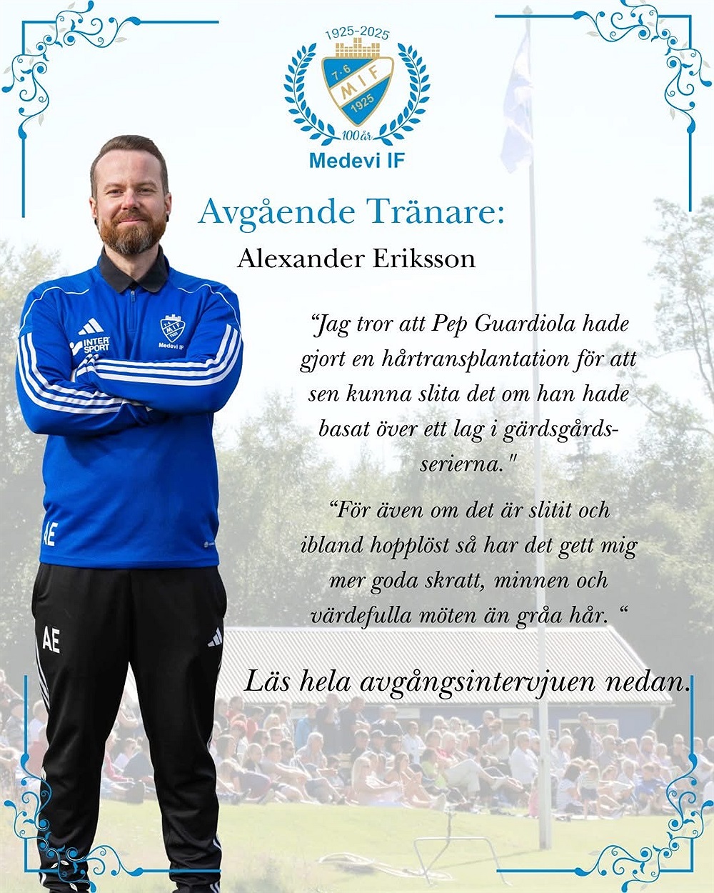 Medevi IF vill med sitt största Medevihjärta tacka av vår avgående tränare Alexander Eriksson. Denna tränarsession varade i 2 år och Alexander lämnar laget i en trygg och harmonisk situation till nästkommande tränare som tar över. Vi kan inte tacka dig nog för dina bidrag till klubben och hoppas att vi inte sett det sista utav dig på Hjärnevallen. Nedan kommer en längre avskedstext från Alexander själv: