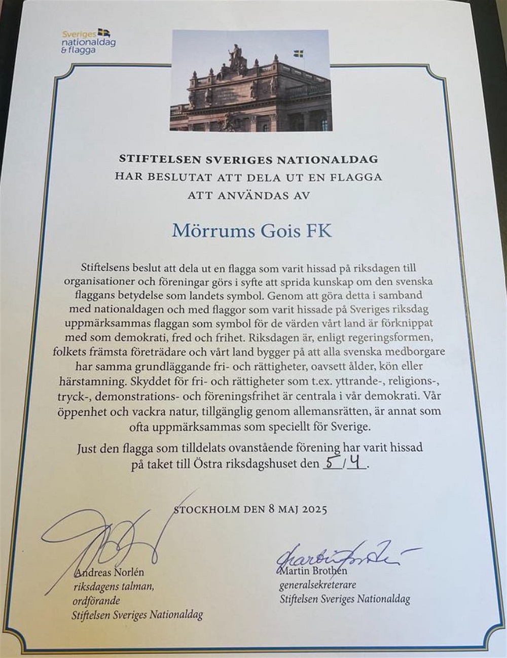 Stiftelsen Sveriges Nationaldag har delat ut en flagga att användas av Mörrums GoIS FK!