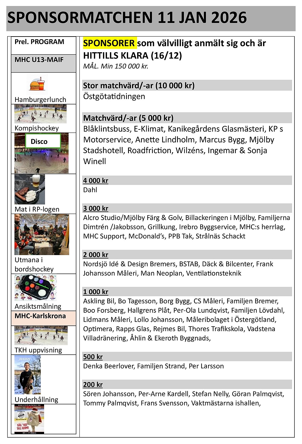 ANMÄLAN enklast till: Klicka Sponsormatchen 11 jan 2026 - Google Formulär, eller maila marknad@mjolbyhockey.com., alt. ring Frans Svensson, 070-849 20 08.