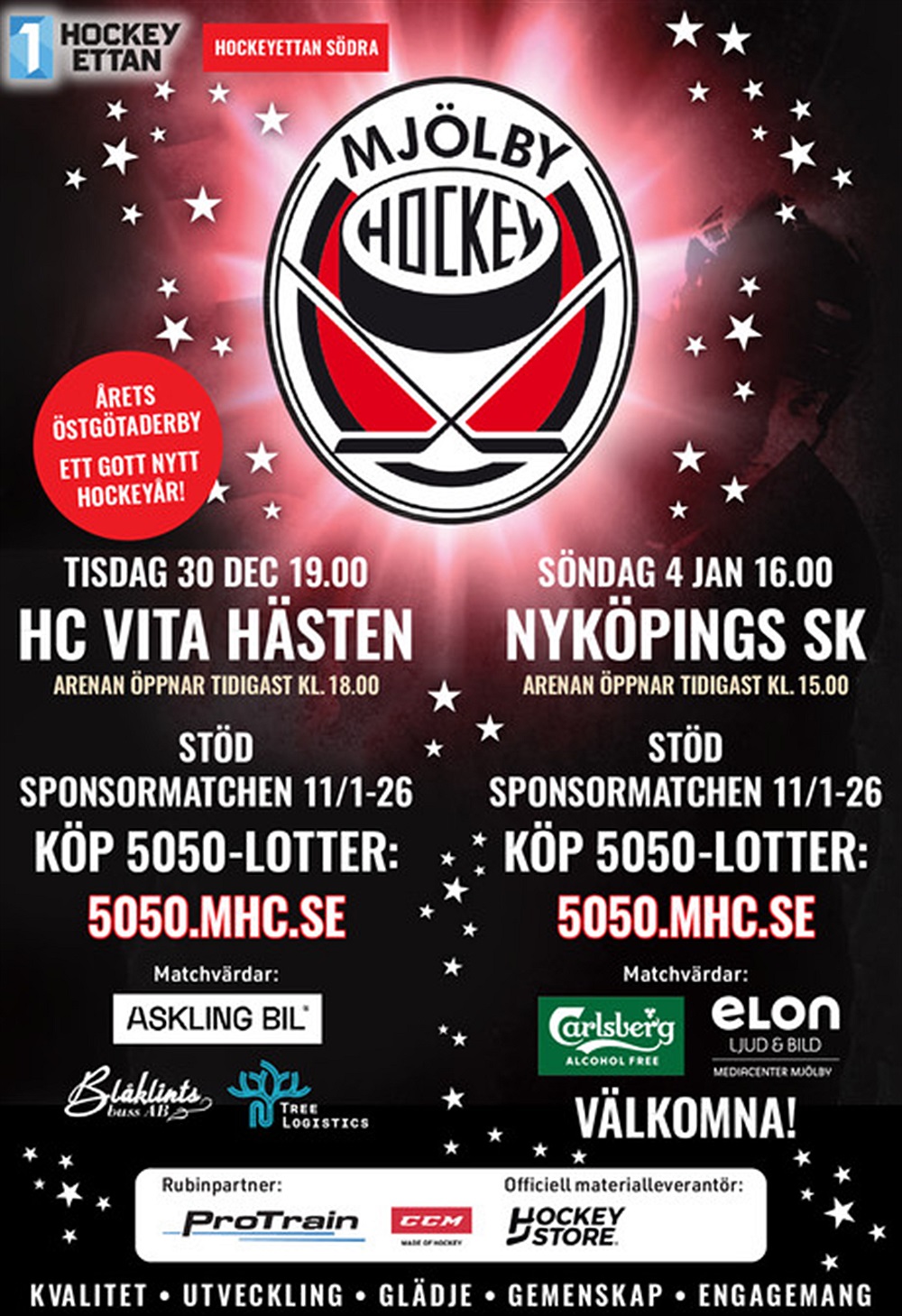 5050.lotter till Hästenmatchen kan du köpa redan nu om du befinner dig i Mjölby kommun. Och du som vill stödja föreningen vid Sponsormatchen den 11 januari gör det gärna genom att gå in på Sponsormatchen 11 jan 2026 - Google Formulär.