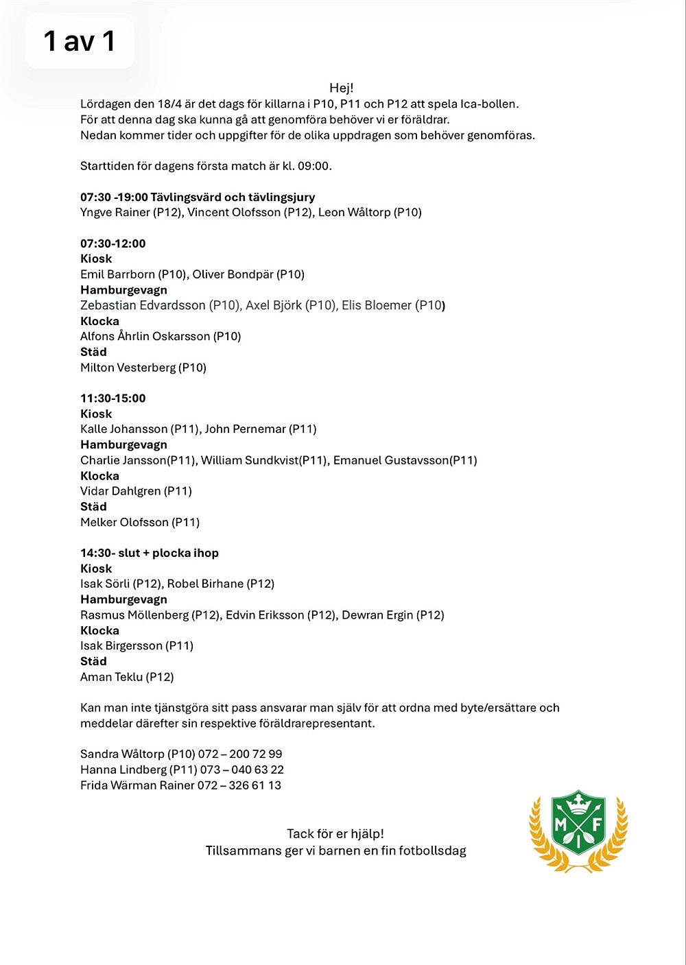 Spelare födda 2009 och 2010 får tjänstgöra själva, men för våra pojkar gäller alltså att det är vi föräldrar som kommer, sedan får pojkarna naturligtvis vara med och hjälpa till.