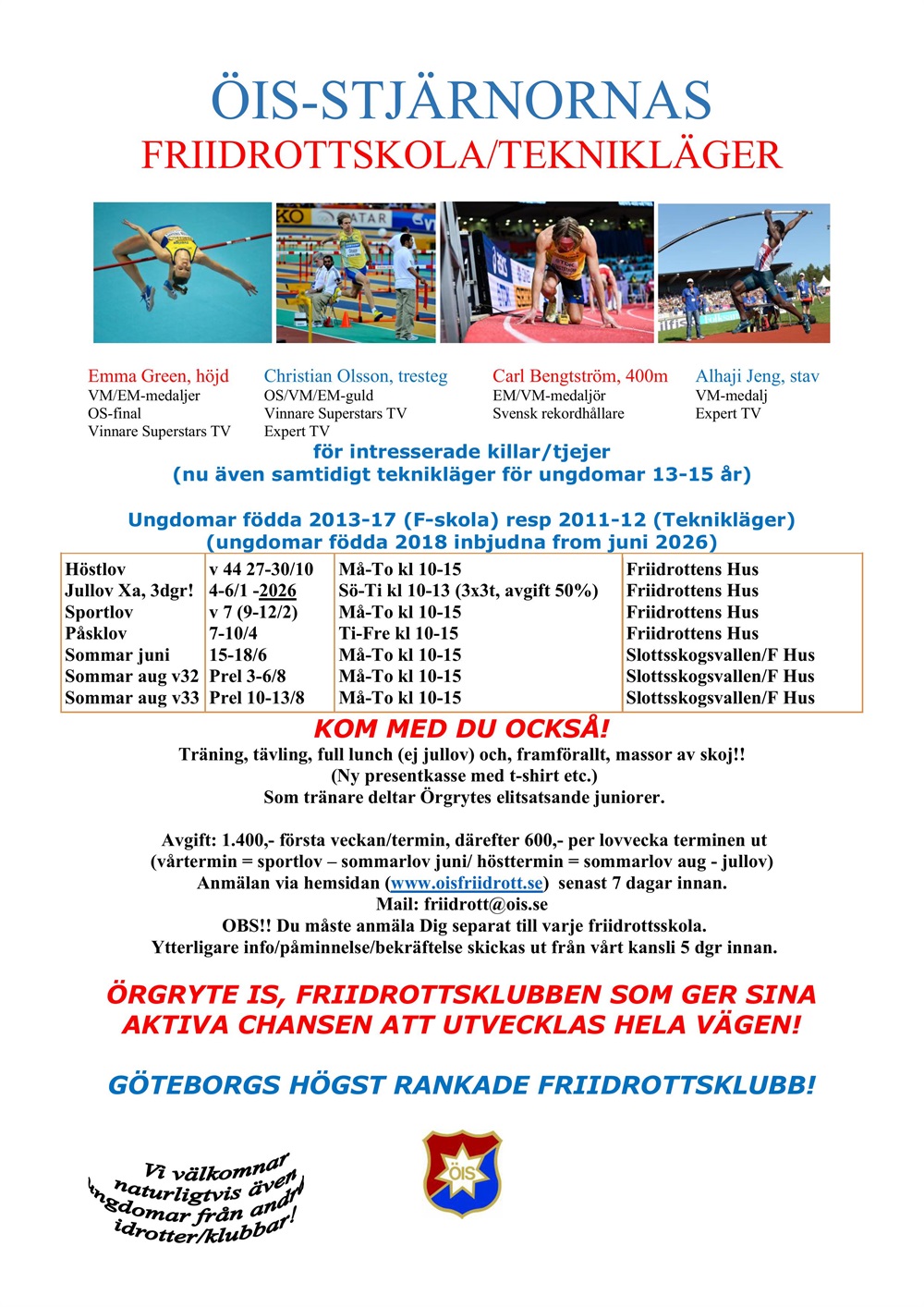 Vi samarbetar på ungdomssidan med Örgryte IS och det gäller även friidrottsskolorna på loven. Nu är det dags att boka platser för sport- och påskloven. Klicka på bilden, så får ni all information om om friidrottsskolan.