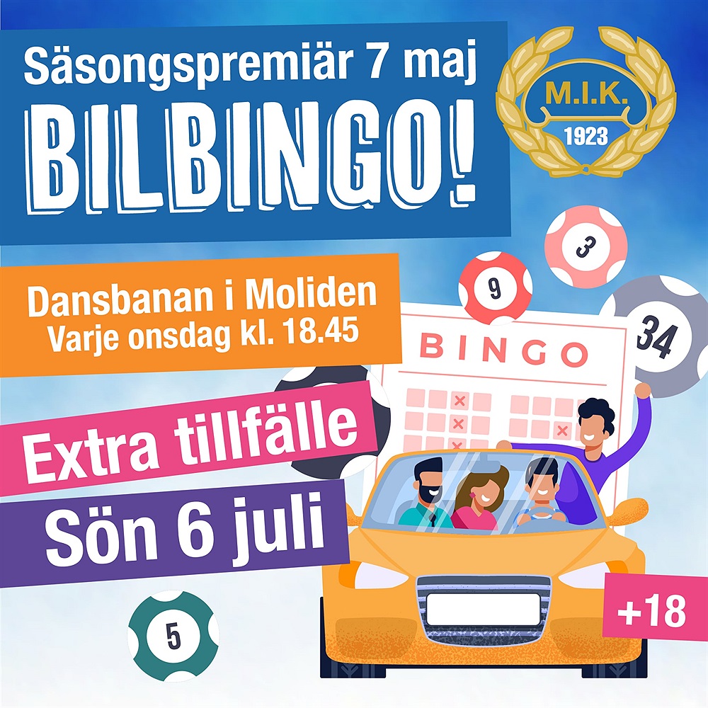 Molidens IK kör bilbingo från den 1 maj - 25 september 2024. En härlig aktivitet för hela familjen. Kom och besök oss under säsongen! Det finns fika till försäljning från 17:00, försäljning av bingobrickor börjar 17:45 och första spelet börjar 18:45.