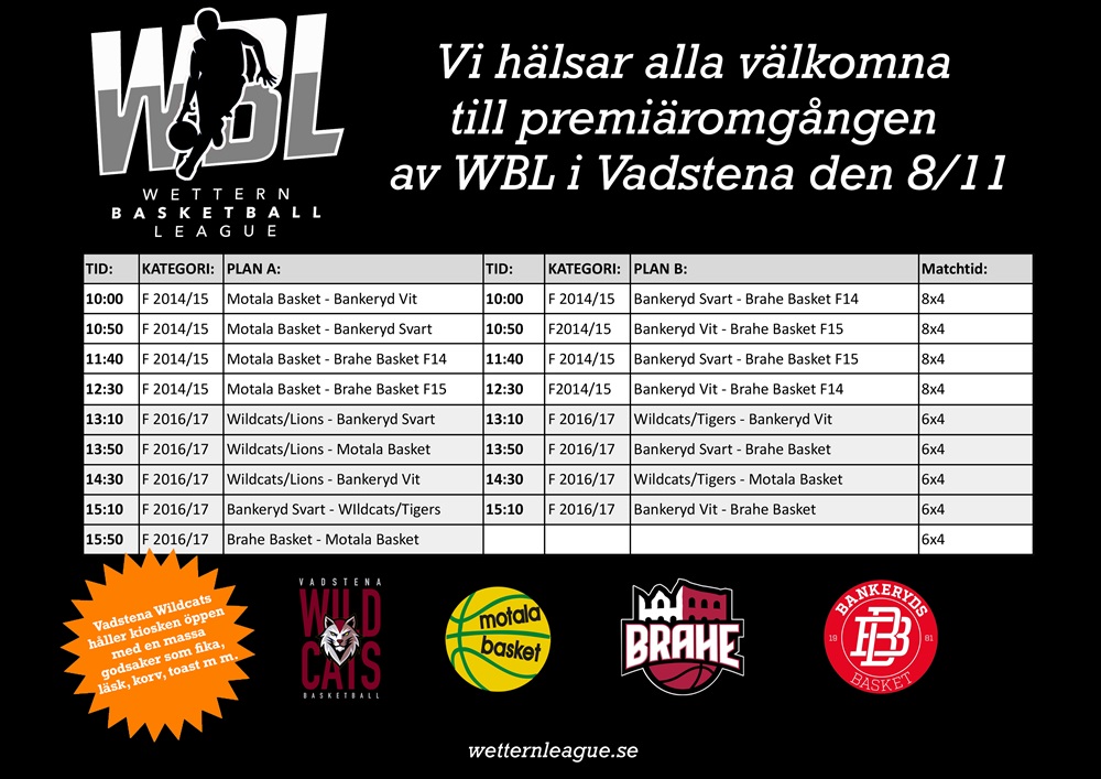 Lördagen den 8 november åker vi till Vadstena och deltager i säsongens första omgång av WBL, Wettern Basketball League. Det kommer totalt att bli fyra matcher för oss, och det kommer att bli tufft för det blir knappt någon vila mellan matcherna alls. Vi kommer att möta Brahe Basket och Bankeryd Basket som kommer med flera lag. (se spelschema)