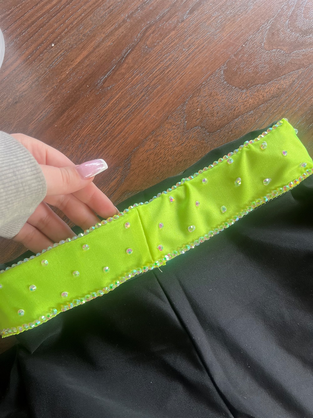På byxorna ska det pärlas runt om på båda kanterna. Och emellan dessa ska det sitta slumpvis utsatta pärlor.