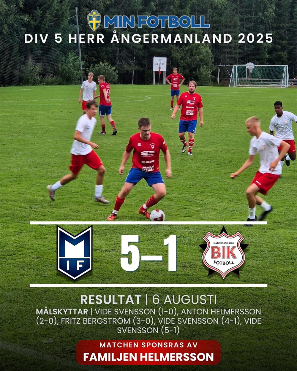 Det blev en efterlängtad och övertygande seger för Myckelgensjö IF när man tog emot BIK från Härnösand på Georgsvallen. Hemmalaget rivstartade och ledde med 2–0 redan efter fem minuter och kontrollerade därefter matchen med fint spel. Matchens lirare Vide satte ett hattrick och verkar ha hittat formen.