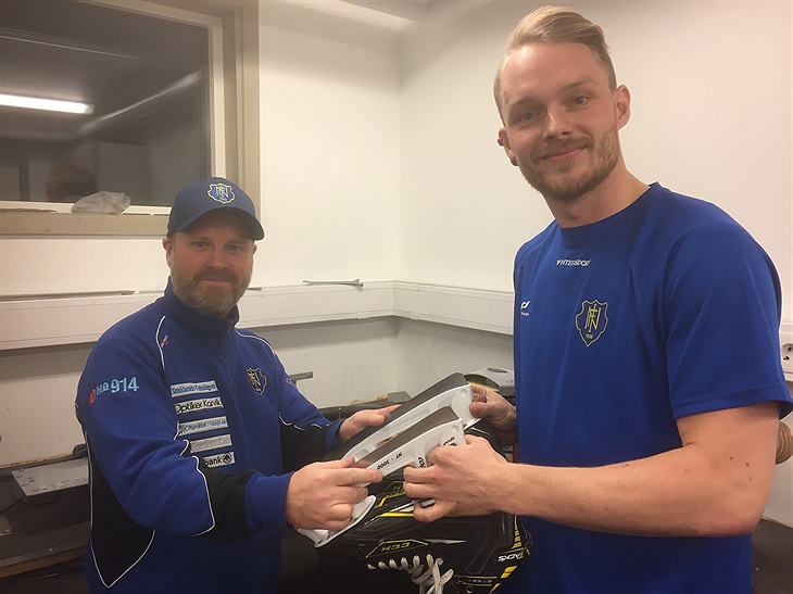 Materialförvaltaren Anders Svensson ser till så att NIF:s målkung Marcus Magnusson har skarpt slipat till annandagsderbyt i Tranås. Sitt första A-lagsmål gjorde "Mackan" just mot Bois. Bild:Thomas Holmqvist.