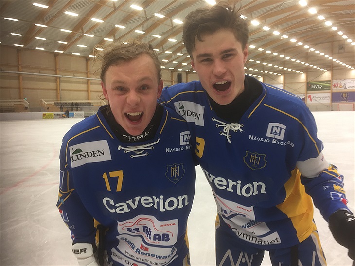 Stor glädje förstås hos två stora matchvinnare i NIF:s J 20-lag, Viktor Hulthammar och Kalle Öberg efter 10-4 mot Vänersborg. Viktor gjorde fyra mål och Kalle spelade fram till hälften av de tio NIF-målen. Bild. Thomas Holmqvist.