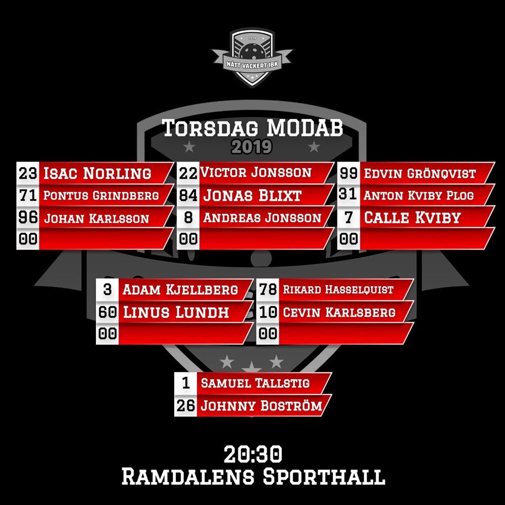 Det är med stolthet Nått Vackert IBK lanserar torsdagens trupp mot modab. Ett innehåll av 3 forwardspar som kommer ställa till det för samtliga lag i serien, 3 centrar som alltid gör 110 arbetsinsats blandat med skapande av chanser. Seriens bästa backsida är ett totalt faktum både defensivt och offensivt.