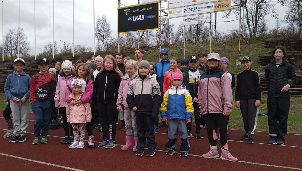 Varma barn efter uppvärmning inför tävling med vår äldsta grupp, lite kallt och blåsigt men ändå en härlig eftermiddag på Matojärvi med tävlingar i längdhopp, sprint 60 meter, kulstötning och löpning 400 meter. Äldsta gruppen avslutade med långa kast. Vi är glada att Reklam och grafiska i Kiruna monterat upp vår sponsorskyllt, nu ska vi tillsammans hitta fler företag som vill hjälpa oss.