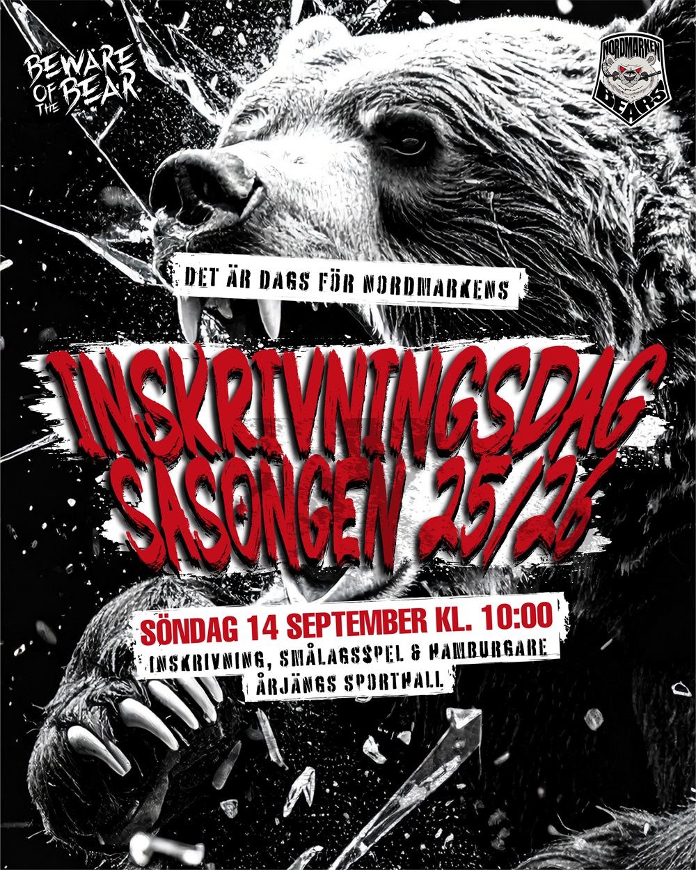 Nu står innebandysäsongen för dörren på riktigt! Söndagen den 14/9 kl. 10:00 kör vi årets Inskrivningsdag för dig som vill spela Innebandy i Nordmarkens IBF säsongen 25/26! För att spela i något av våra lag denna säsong måste man vara född 2019 eller tidigare. Uppstart av lag för barn födda 2018/2019 kommer att kommuniceras vid ett senare tillfälle.
