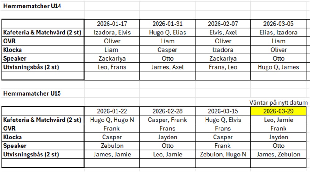 Ovan ligger nu schema för matchfunktioner. Vi väntar fortfarande på besked om nytt datum för U15 matchen som just nu ligger 29/3 i kalender. (Uppdaterar så snart vi fått ett datum).