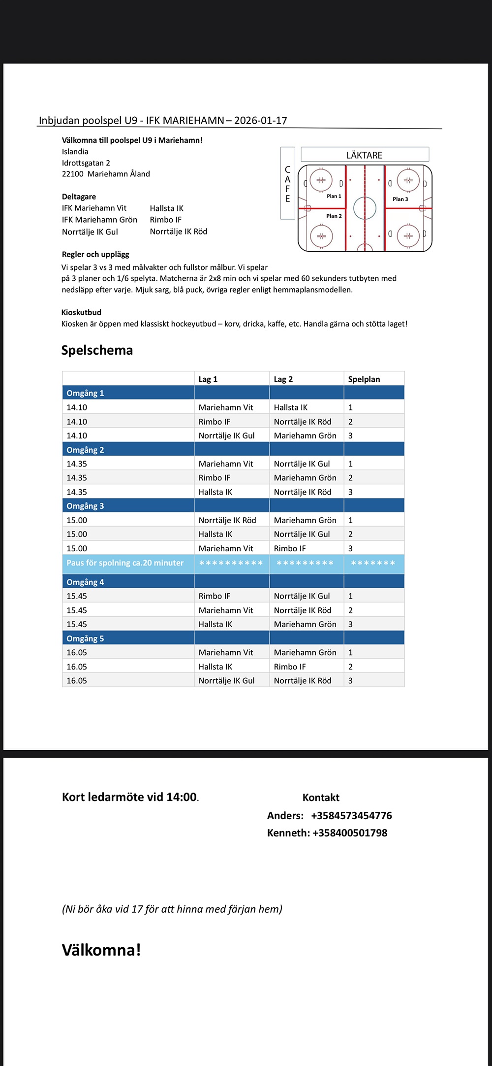 här kommer spelschemat för poolspelet på Åland 17 januari.