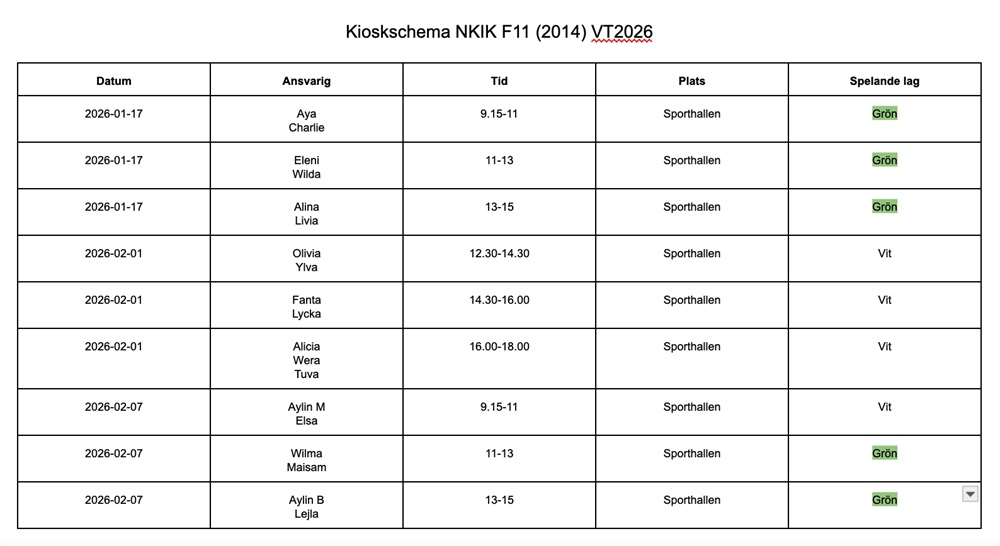 Hej alla föräldrar. För att underlätta för er kommer vårens kioskschema för hemmamatcherna redan nu. Kan man inte sin tilldelade tid/dag, försöker man i vanlig ordning att i första hand byta sitt pass med en annan förälder. Om man har problem med detta - kontakta oss ledare.