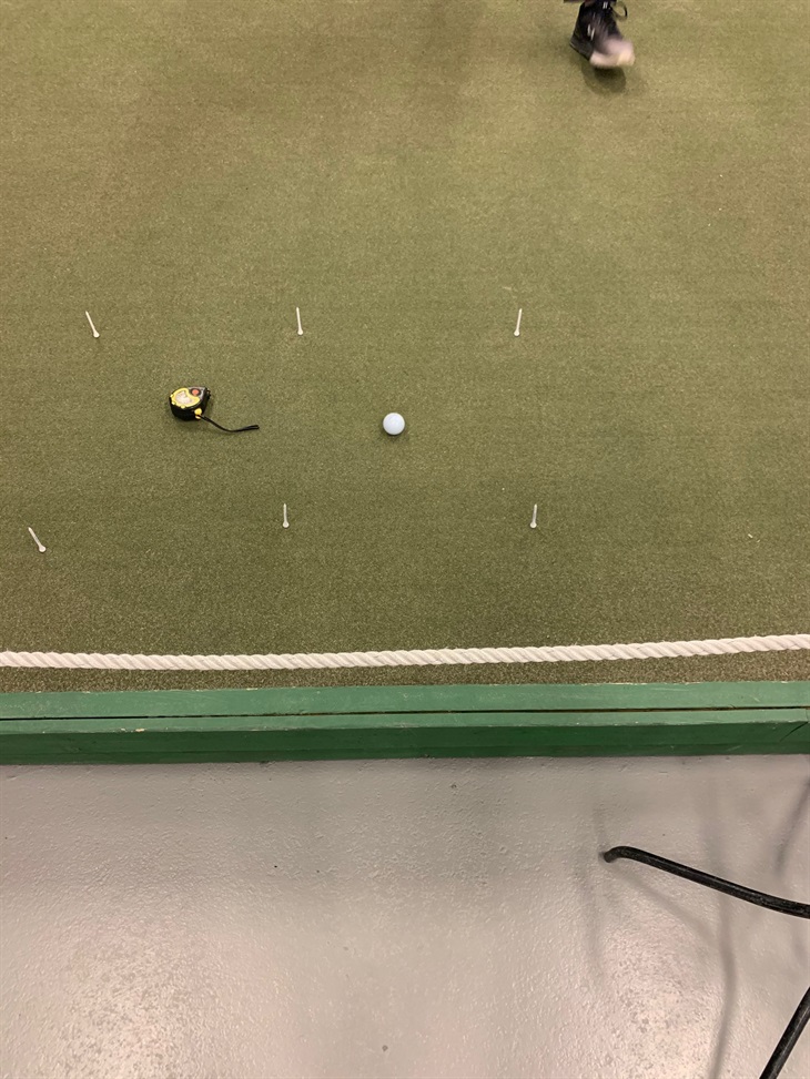 Sätt upp peggar (helst tejp) med 50 cm mellan varje pegg i en kvadrat. På bilden ser ni två kvadrater för vi hade två olika stationer igår. Målet är att få bollen att stanna innanför kvadraten.