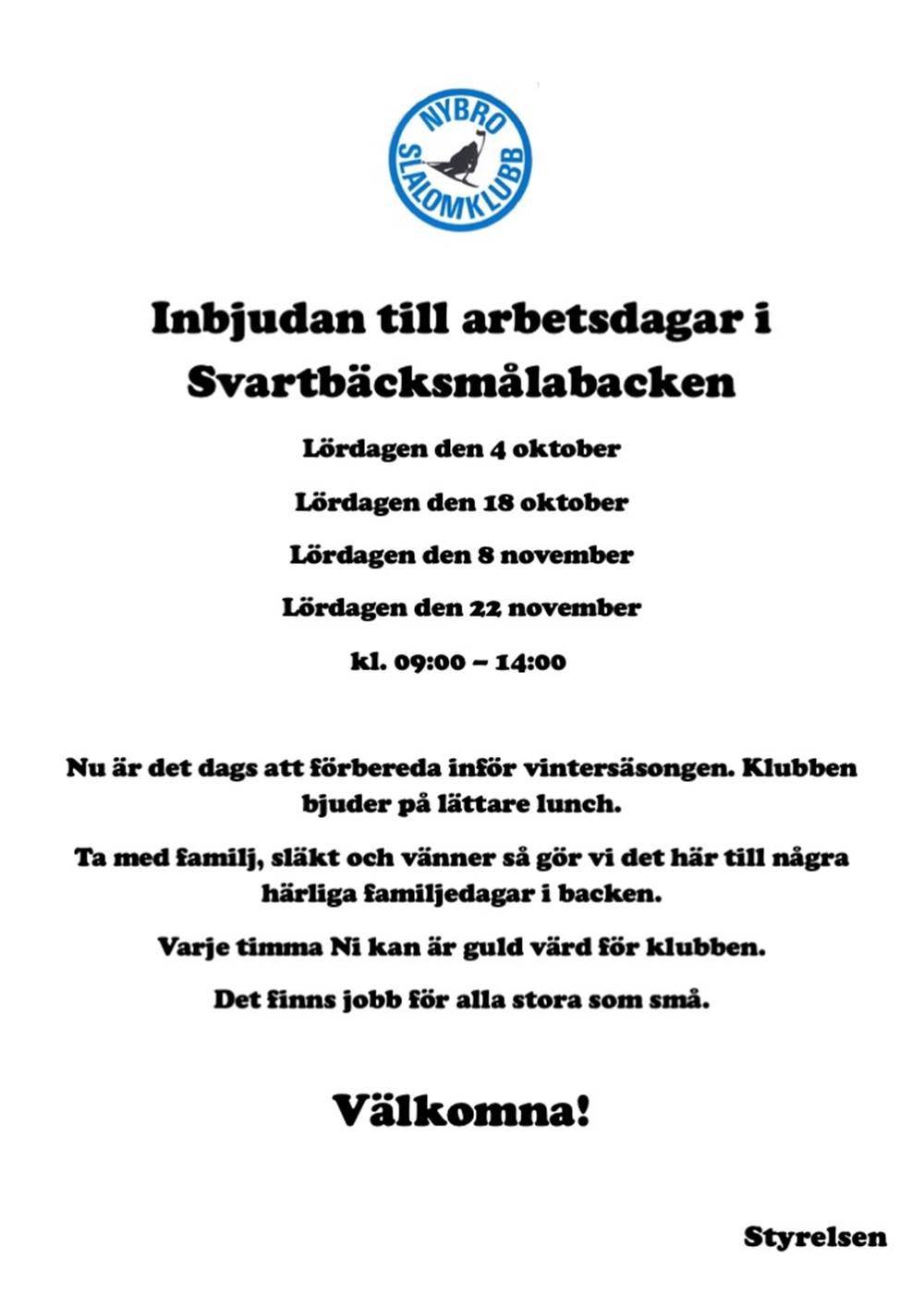 Nu kör vi igång arbetsdagar i backen. Varje timma Ni kan är oerhörd värdefull för klubben och möjliggör att vi kan öppna backen i vinter.