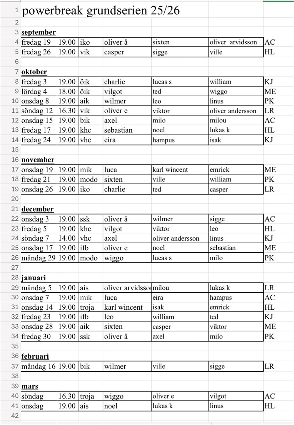 Här kommer schemat för powerbreak, om man inte kan sin match så är det upp till var och en att ordna en ny. ( inte ledaren)