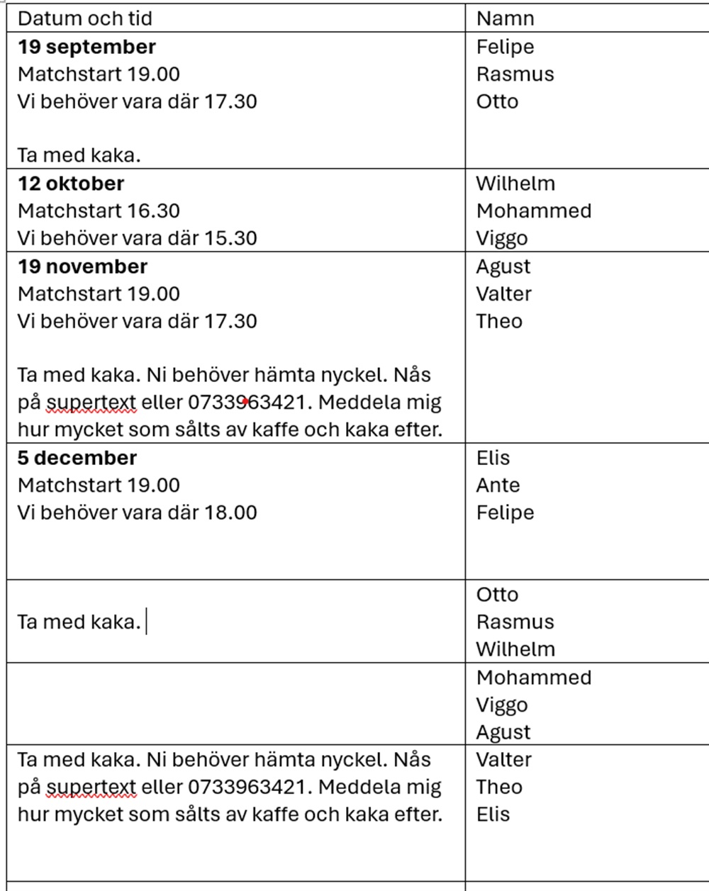 Byt med varandra om det inte passar och meddela mig om ni gör byten. /Sanna
