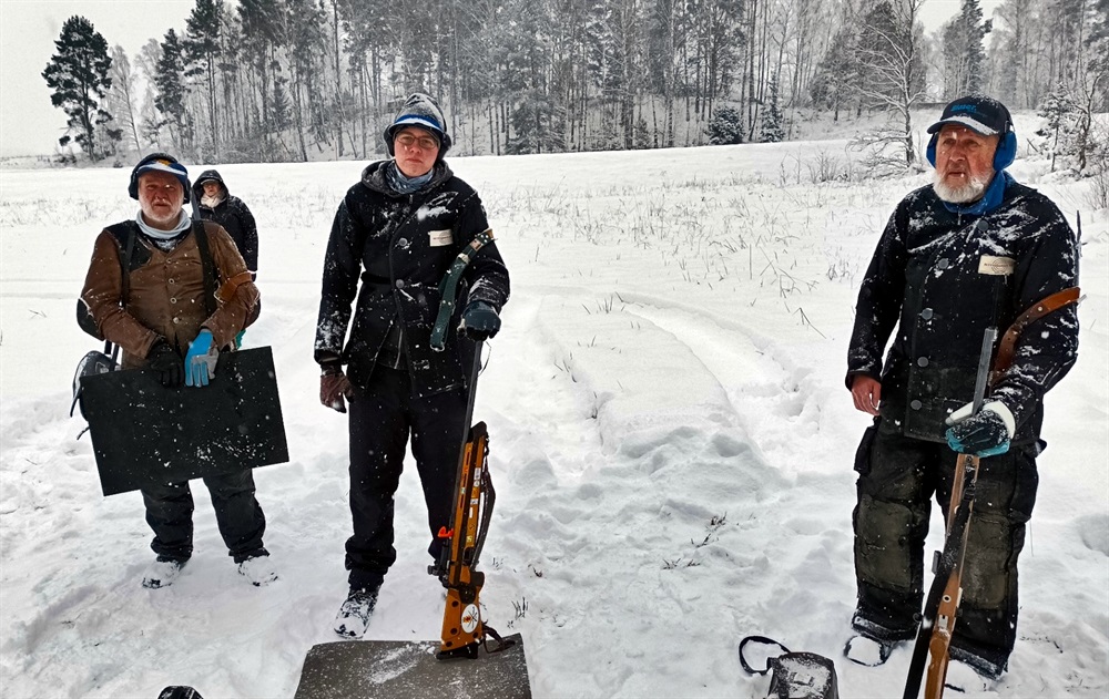 De vädervarningar som hade utfärdats gjorde att endast nio tappra skyttar vågade ta sig till Vrena-Nytorp. Fem från Vrena, två från Oxelösund samt Björn och Alexander från Nyköping. Björn gick i första patrullen och Alexander i andra, därför saknas Björn på dagens bilder. Björn fick ihop 29 träffar varav 17 inner vilket han väl inte var helt nöjd med. För Alexander gick skyttet väldigt bra så länge han kunde få iväg några skott. På de första fyra stationerna hade han 24 träffar, d v s ingen bom. Sedan började dock problemen på de sista två stationerna, p g a isbildning i patronläget lyckades Alexander inte få iväg ett enda skott på station 5 och 6 och stannade därför på 24 träffar varav 20 inner.