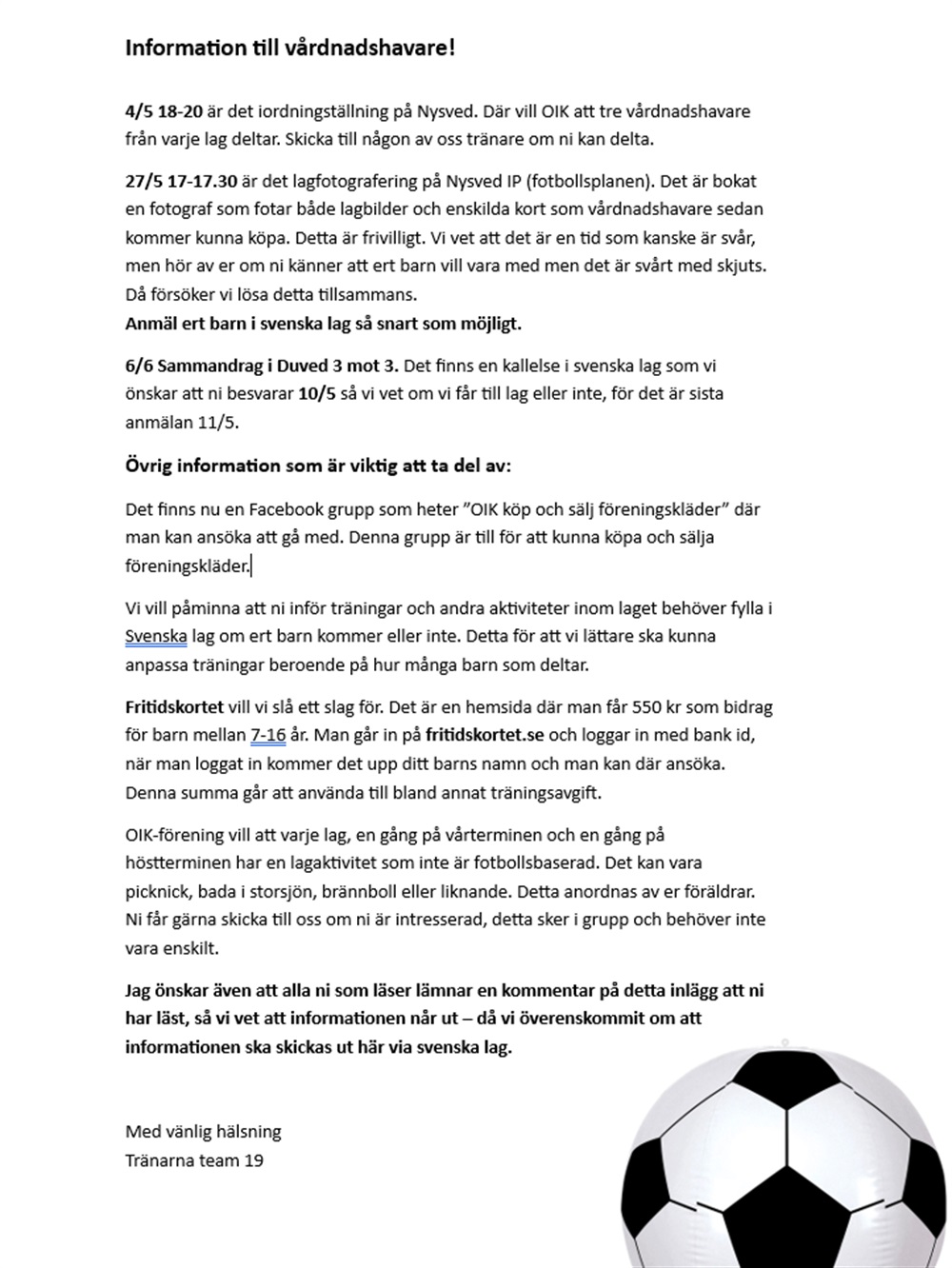 Jag kan ta på mig att anordna någon aktivitet för laget nu i vår/sommar tillsammans med någon annan villig :)