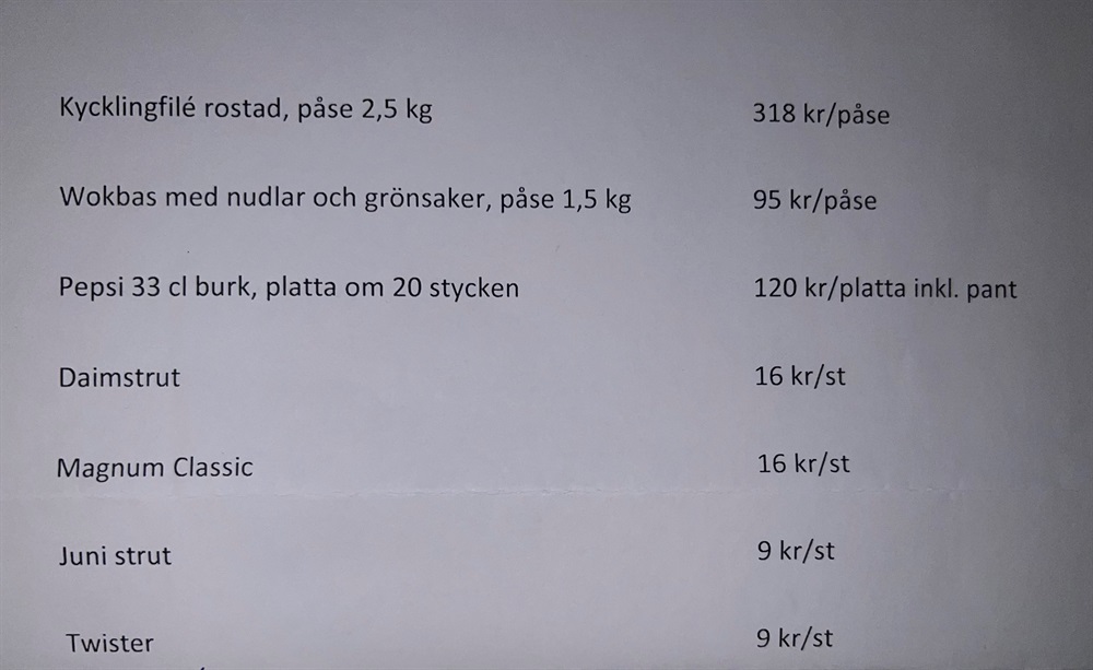 Det som finns till försäljning är kycklingfilé till wok, grönsaksblandning/wokbas, läsk och glass.