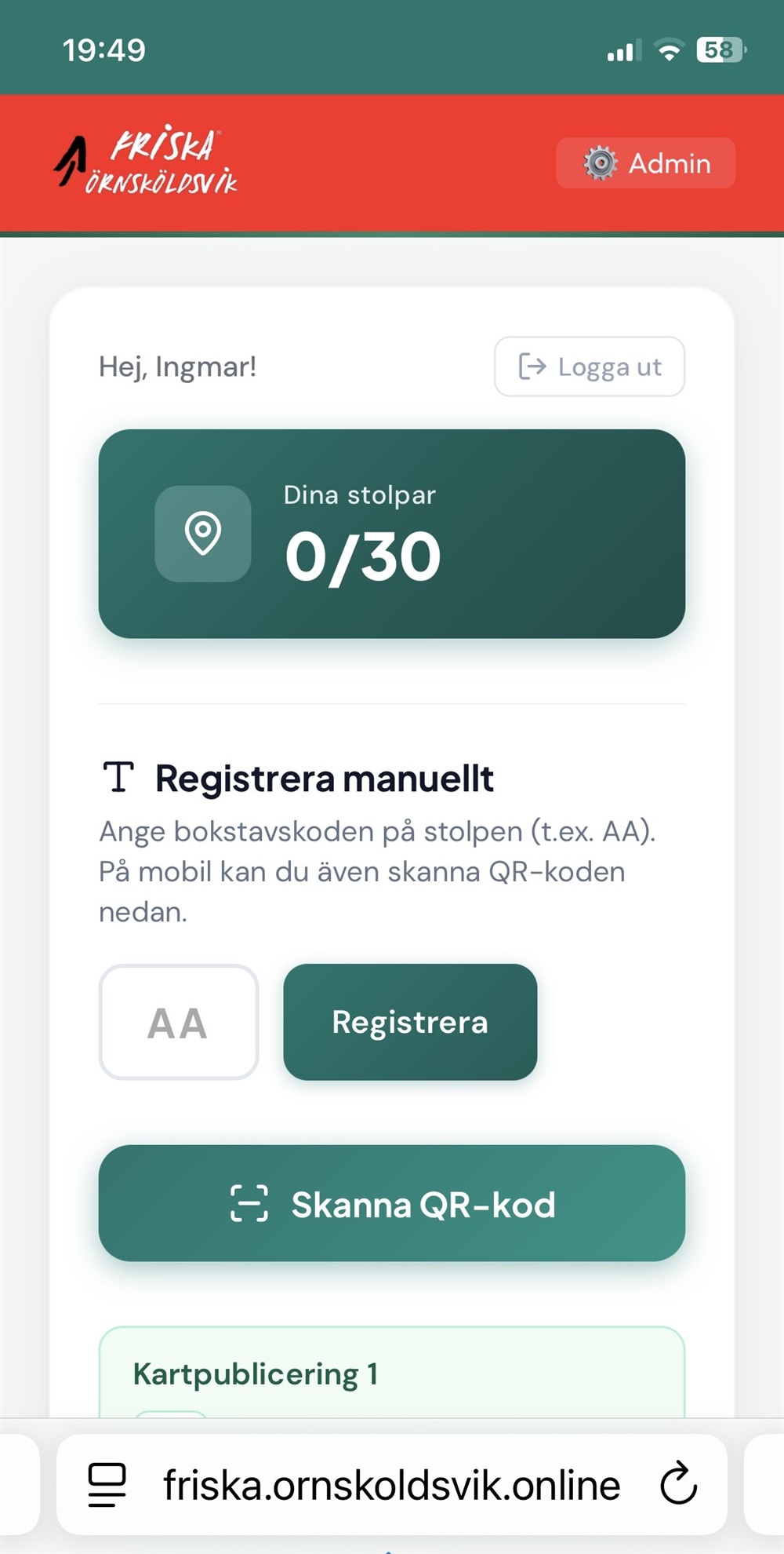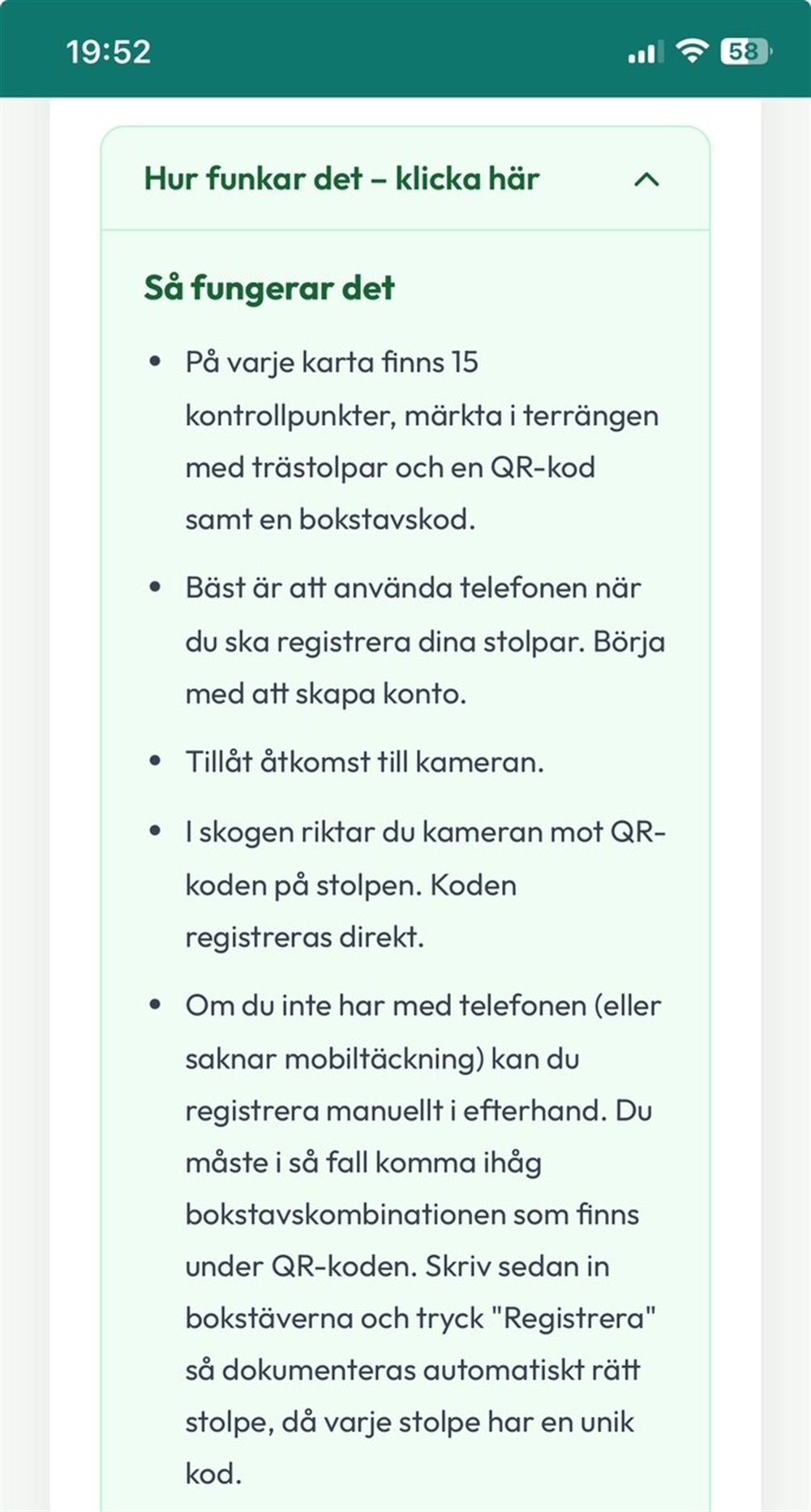 I skogen riktar man bara kameran mot QR-koden så registreras stolpen automatisk. Den som vill registrera manuellt behöver bara skriva in bokstavskoden så ramlar rätt kontroll in i databasen. Man ser också direkt i sin telefon vilka stolpar som är registrerade.