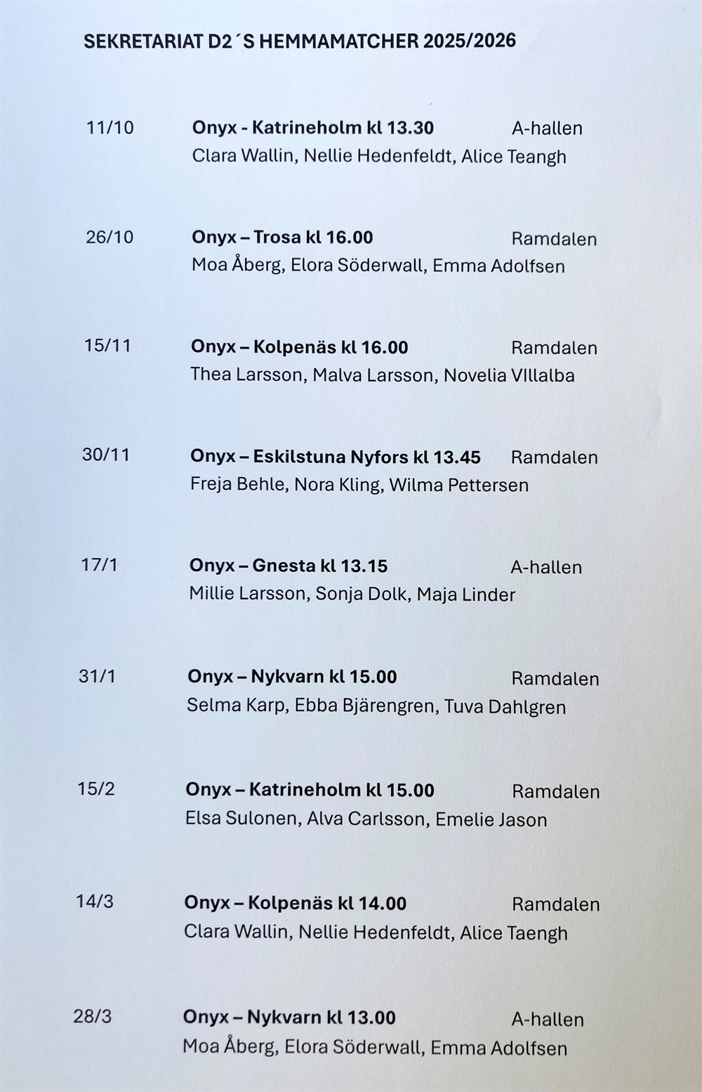 Då D2-truppen är så pass liten kom vi på lagträffen i måndags överens om att hjälpas åt i sekretariatet vid D2’s hemmamatcher. Det rör sig om ca en match/person (se bild) .