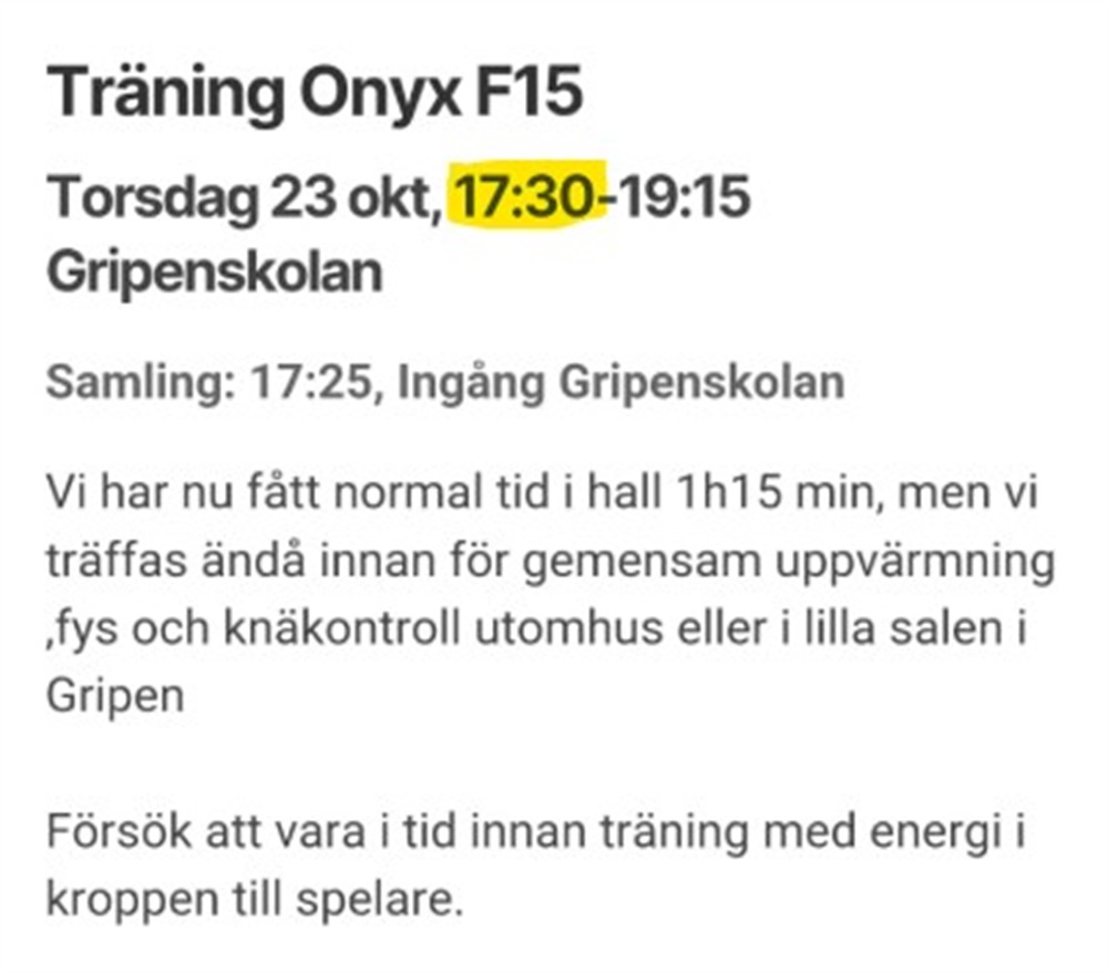 Torsdagar 17.30- 19.15 (varav första 30min är fys utomhus enligt kallelse)