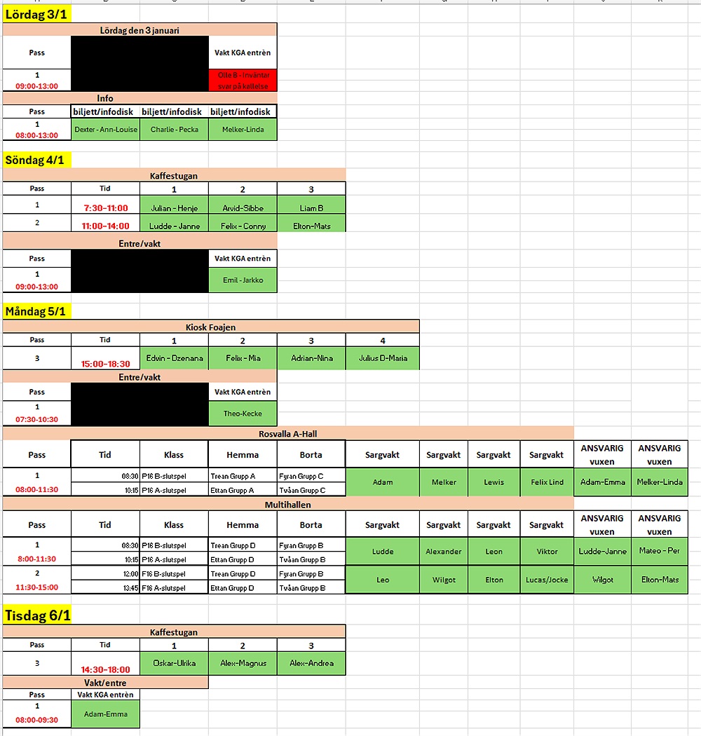 Bilden är nu uppdaterad. Efter gårdagens "föräldrasurr" så bestämdes det att fram till på söndag 7/12 är schemat öppet för att själv välja pass av de som är lediga. Därefter delas passen ut till de som inte skrivit upp sig för at vi ska få hela laget att bidra vid dessa typer av arbetsuppgifter. Kan man inte tiden man får så får man själv lösa ett byte. Så passa på att välja det passet/passen som passar er bäst.