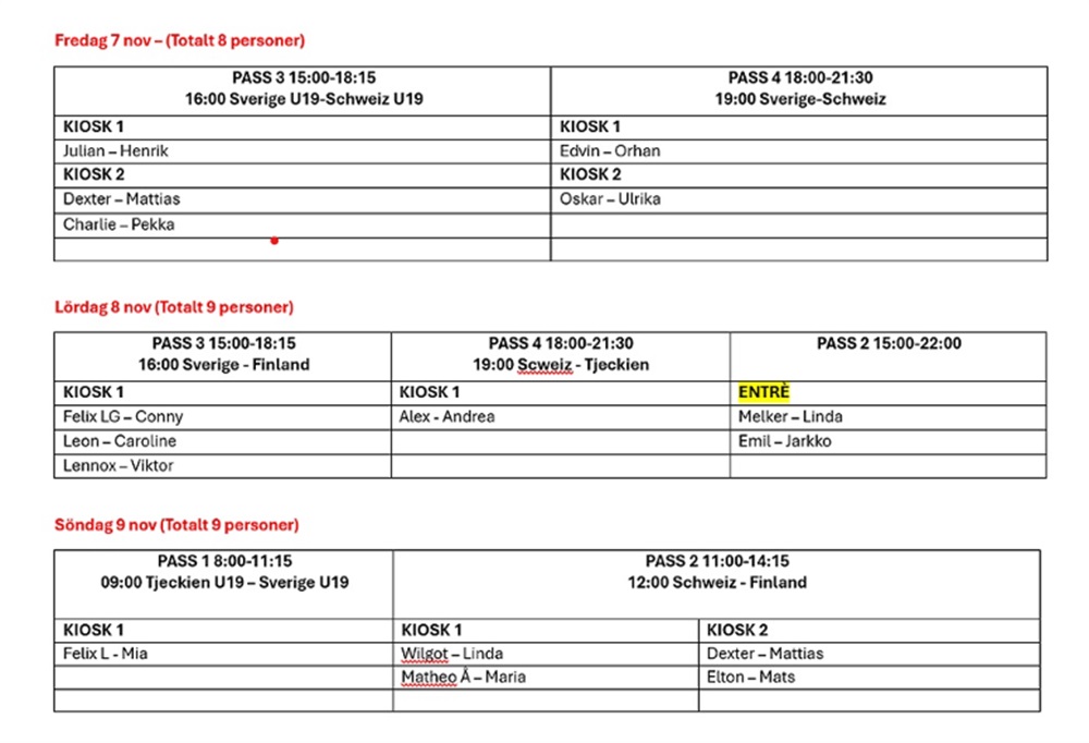 Skriv i kommentarsfältet vilka pass ni kan ta, så uppdaterar jag schemat.