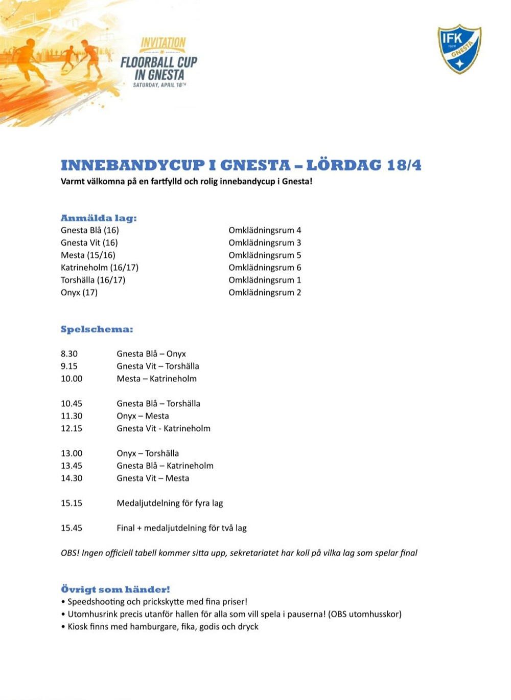 Nästa helg är det Cup i Gnesta. Vi har första match 8.30 så samling i Gnesta 7.45. Vi hoppas på roligt spel. Vi kommer prova på att spela på blå nivå. Det är då fyra spelare på planen och flygande byten och lite längre matcher bland annat. Vi kommer att träna på detta på torsdag. Är ditt barn inte anmält till cupen ännu så gör gärna det snarast så vi vet hur många vi blir. Spelschema syns här på bilden. Detta är våra sista matcher för denna säsong.