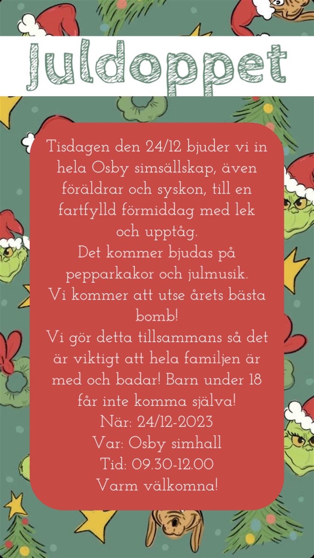 Till helgen välkomnar vi alla simmare och familjer till Osby simsällskaps interna tävling. Det blir en dag i simhallen som börjar med insim kl 9,00 och tävlingsstart kl 10,00. Alla simmare samlas i simhallen 8,45!