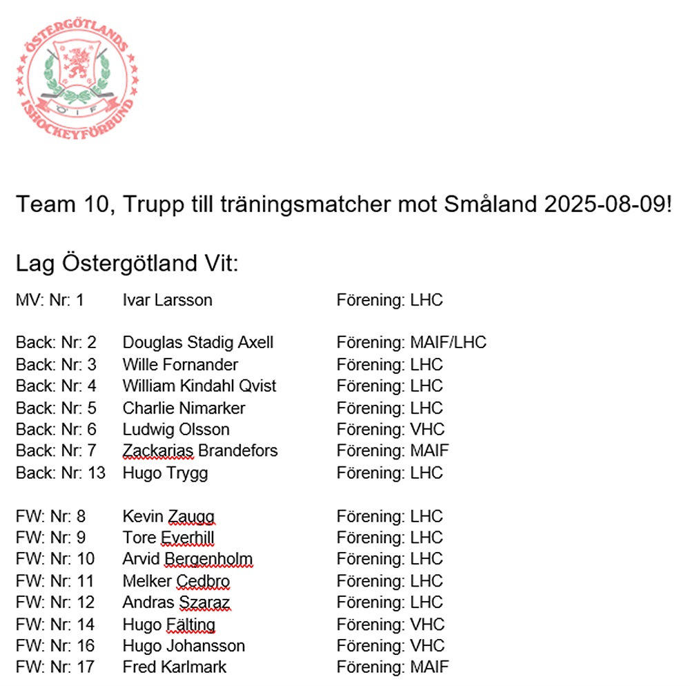 2025-08-30: Träningsmatch mot Örebro i Motala, Matchstart 15.00, Samling 13.00 – Is uppvärmning 14.20 (3x20min + Förlängning 5 min och straffar.