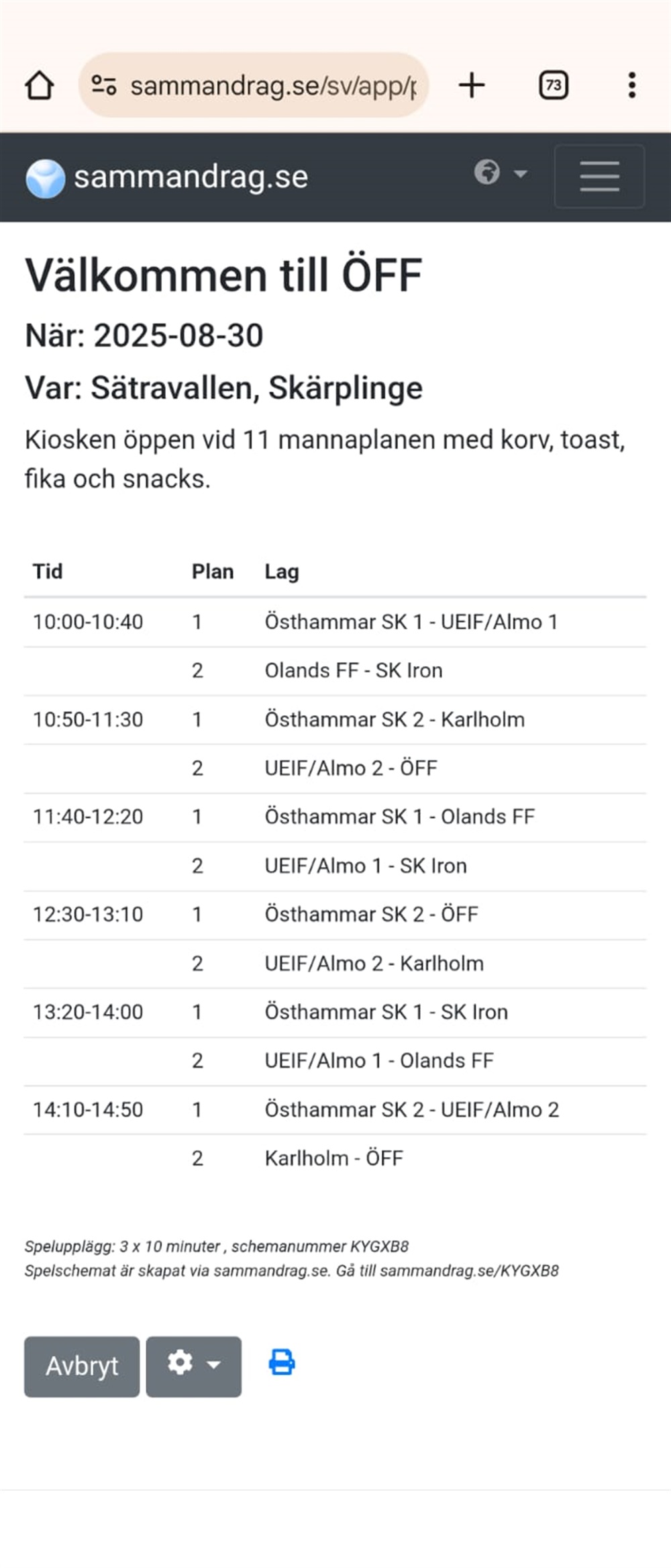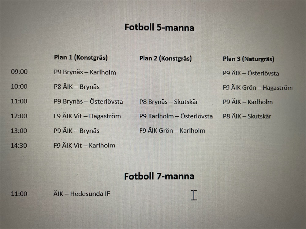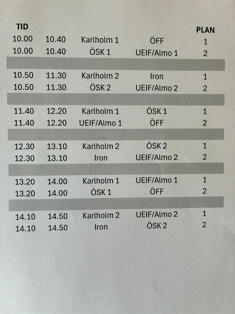 Nu är spelschemat här gällande lördagens sammandrag i Karlholm. Vi samlas på Rönningen IP kl. 9.15 för ombyte till matchkläder och uppvärmning. Vårt omklädningsrum ligger i den större byggnaden vid parkeringen/kiosken.