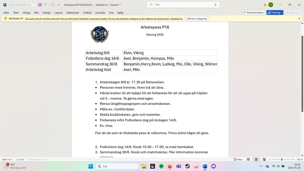 Arbetspassen på lördag är fördelade utifrån tidigare information. Vi kommer samarbeta med P12/13 och herrlaget. (Det står barnens namn så får ni vårdnadshavare fördela passen mellan er). Är det någon som har förhinder måste ni hitta en ersättare inom laget.